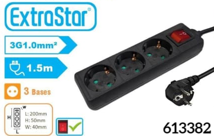 ALARGADERA 3 TOMAS CON INTERRUPTOR 1,5m NEGRA